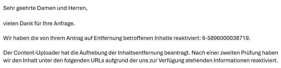 Es gibt auch Fälle, bei denen Google die Bewertung reaktiviert hat, weil der Bewerter Nachweise für einen Kundenkontakt vorgelegt hat. Man erhält dann etwa folgende Nachricht: