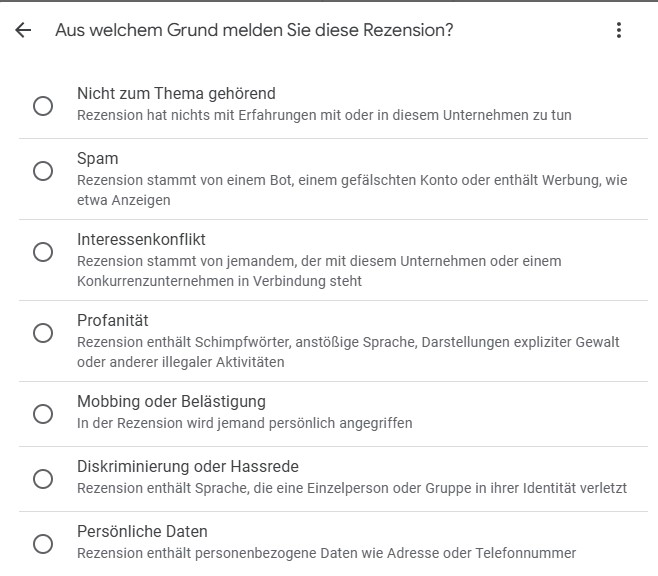 - Über den Unternehmenseintrag: Melden Sie sich in Ihrem Google Profil an, mit dem Sie den Unternehmenseintrag verwalten. Klicken Sie neben der Bewertung einen der folgenden Gründe an: