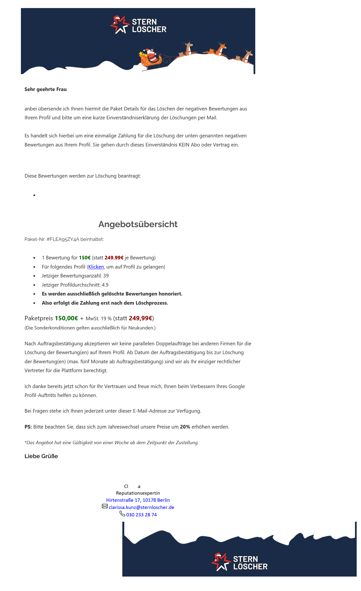 Auf den nach unserer Meinung unzulässigen Werbeanruf folgte außerdem eine E-Mail von Sternloscher. Darin wird der Mandantin das Löschen ihrer negativen Google-Bewertung angeboten. Diese E-Mail haben sogar wir selbst bekommen: