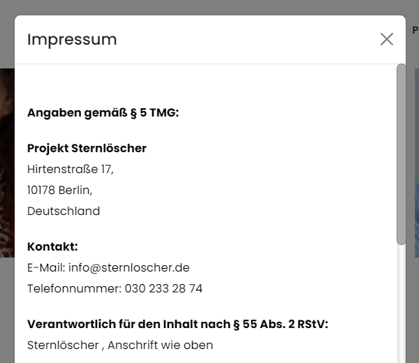 Im Impressum wird nicht der tatsächliche Anbieter genannt, dort heißt es nur Projekt Sternlöscher, Hirtenstraße 17, 10178 Berlin. Die wahre Identität des Anbieters soll offensichtlich verschleiert werden.